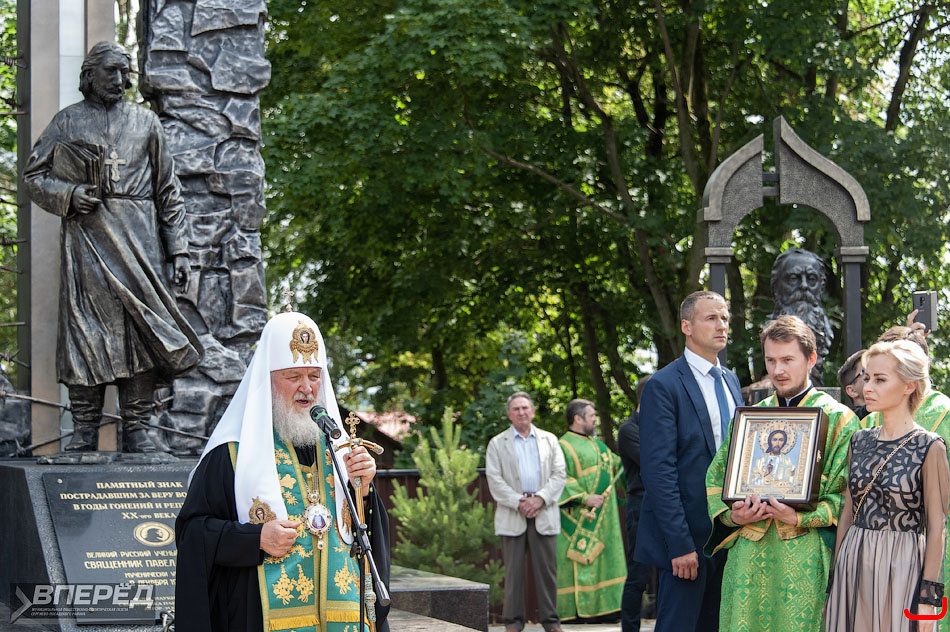 На открытии памятника священнику и учёному Павлу Флоренскому 18 июля провёл молебен патриарх Кирилл