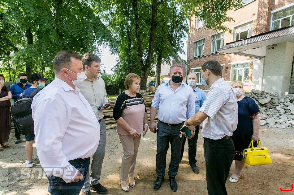Посмотреть, как ведутся работы, на объект приехали глава округа Михаил Токарев и начальник управления образования Ольга Дударева.