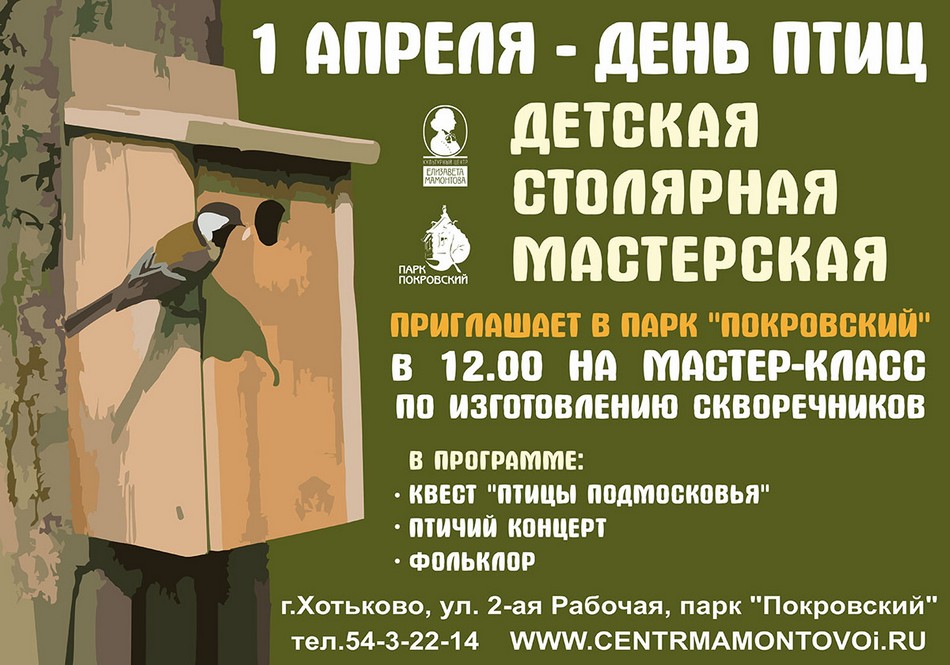 1 апреля, в День птиц, приглашаем на мастер-класс по изготовлению скворечников. В программе также квест и концерт (3+).
