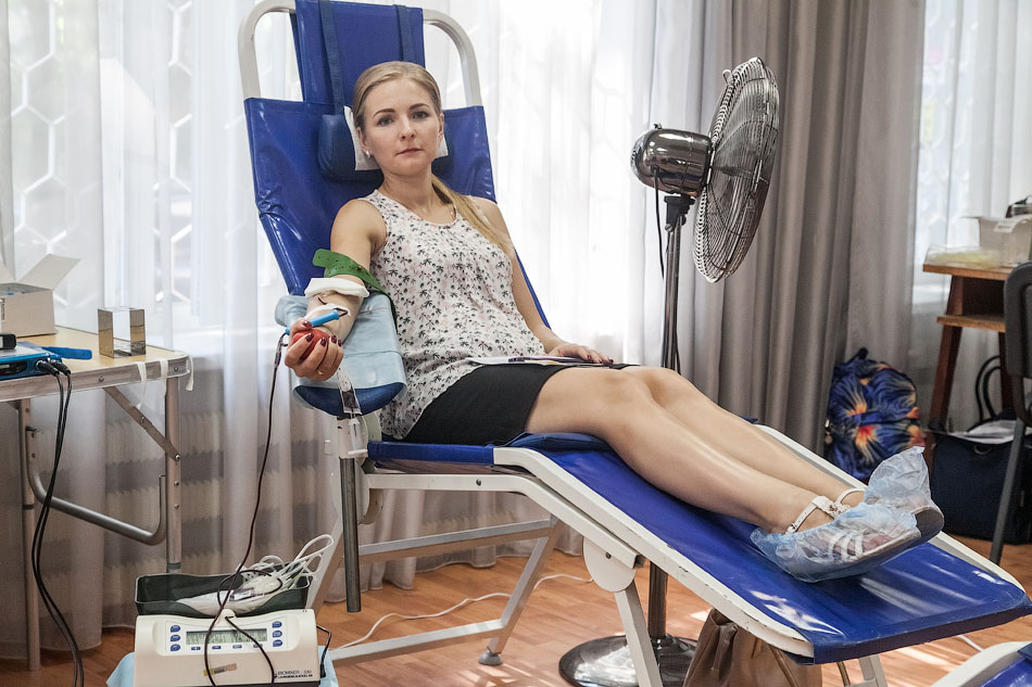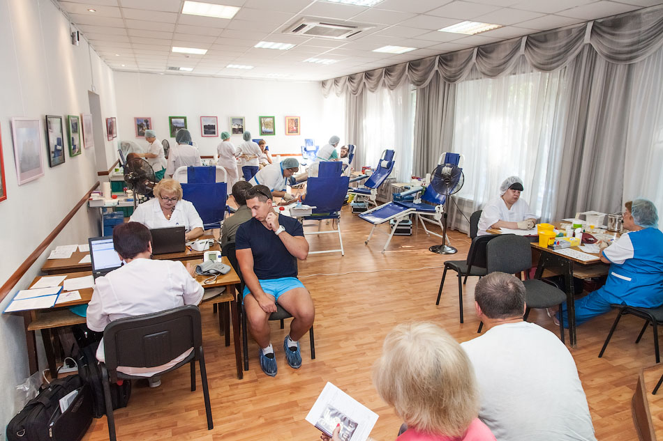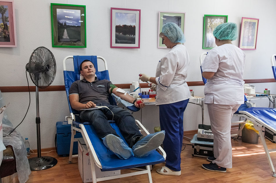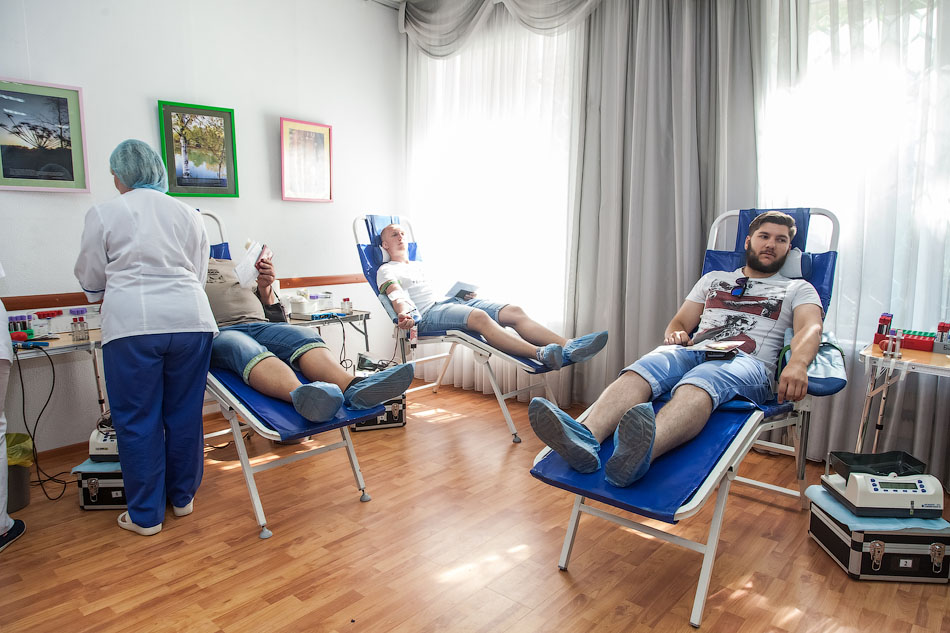 Первое, что поражает, скажем так, – «либеральность» акции. Во-первых, сдавать кровь можно, даже если вы зарегистрированы в другом регионе, просят только указать фактический адрес проживания в анкете. Во-вторых, перед сдачей не нужно голодать, не рекомендуется, конечно, приходить после съеденного ведра острых крылышек, но морить себя с утра голодом нет нужды. В-третьих, вредные привычки тоже не беда — за сигареты меня не похвалили, конечно, но и не отказали. В общем, сдаём свою совсем необразцовую анкету и идём на проверку. Меряют давление — слегка повышенное: нервничаю, сдаю впервые. Пара вопросов о здоровье, после чего иду на процедуру, которой боялся даже больше, чем самой сдачи, — забор крови из пальца на общий экспресс-анализ, который проходит даже слишком легко.