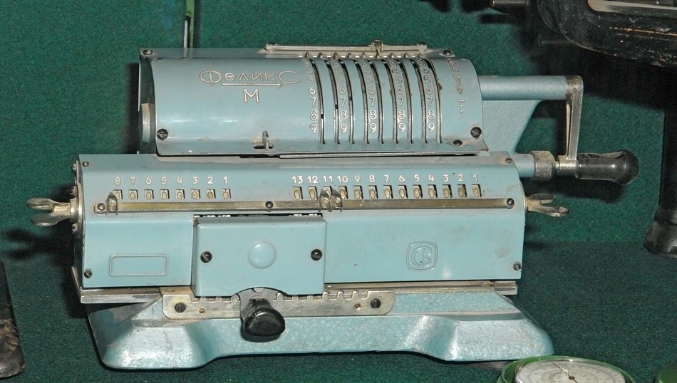 От исторической справки — к технической! Работал «Феликс» следующим образом. Вот как можно было выполнить сложение: выставить на рычажках первое слагаемое, затем повернуть ручку от себя по часовой стрелке. При этом число на рычажках вводится в счётчик суммирования. Потом надо выставить второе слагаемое. А дальше повернуть ручку от себя! При этом число на рычажках прибавится к числу в счётчике суммирования, и мы увидим результат сложения!