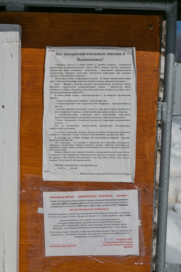 Садовые товарищества пока безлюдны, но в воздухе всё равно витает тревога. На досках объявлений висят призывы выходить на митинг. Хотя, казалось бы, дачников там пока и нет никаких. Градус напряжения чувствуется и в деревне Сахарово, которая находится в 7 км от предполагаемого предприятия, пусть и живёт в деревне на постоянной основе всего 4 человека. Пётр Н. — потомственный «сахаровец», разводящий пчёл, явно не в восторге от инициативы подмосковных властей.