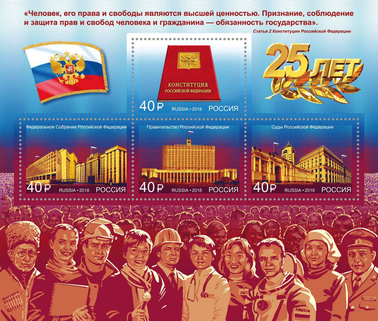 На почтовых марках изображены Конституция РФ, здания Федерального Собрания, Правительства и судов Российской Федерации. На поля почтового блока нанесены флаг России, изображения граждан, а также выдержка из статьи 2 Конституции РФ – «Человек, его права и свободы являются высшей ценностью. Признание, соблюдение и защита прав и свобод человека и гражданина – обязанность государства».
