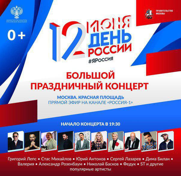 Большой праздничный концерт пройдёт в День России, 12 июня, в Москве на Красной площади. Канал "Россия-1" будет вести его прямую трансляцию. Начало в 19.30