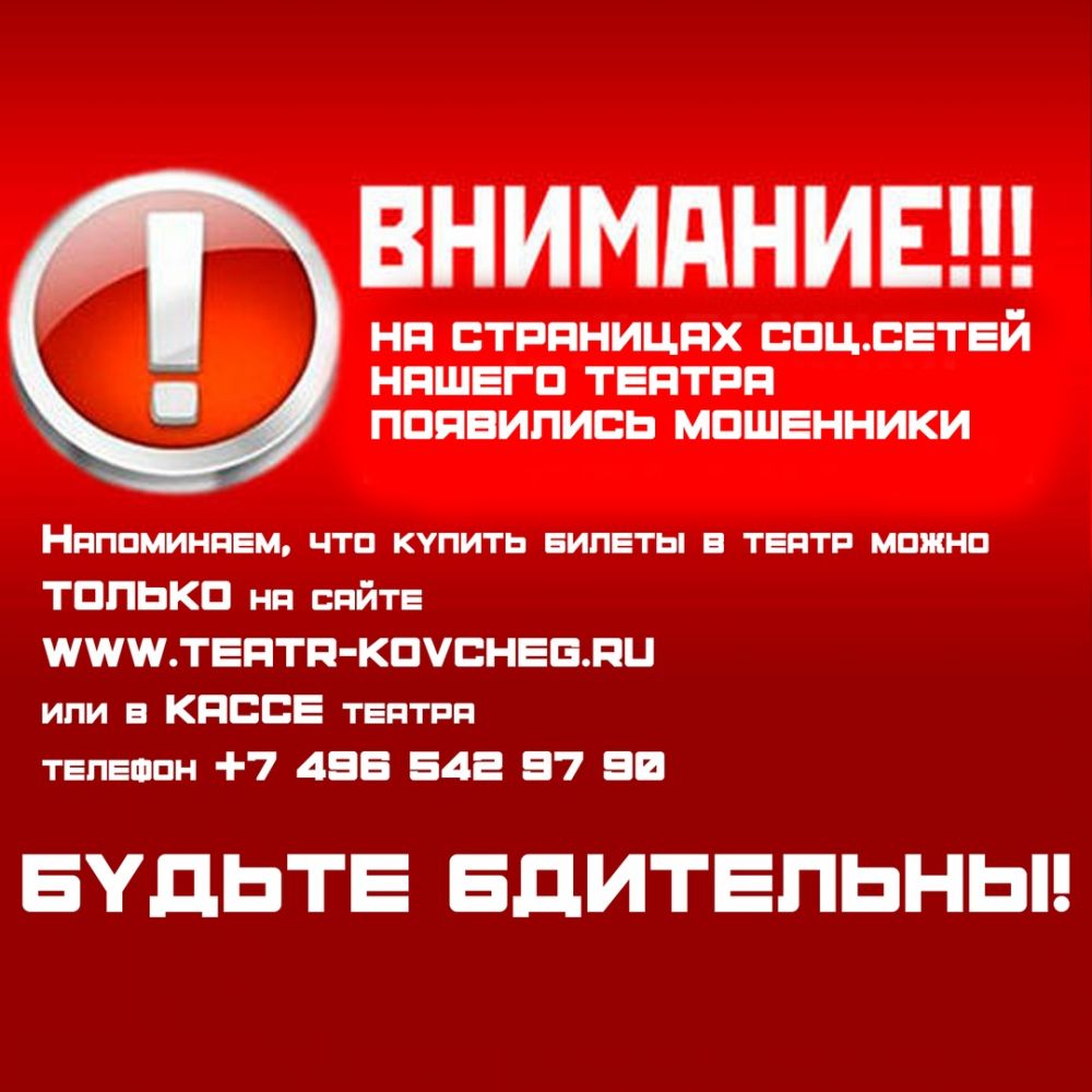 Марина Игнатова, директор театра-студии «Театральный ковчег» предупреждает: покупайте билеты только на официальном сайте «Ковчега» www.teatr-kovcheg.ru или в кассе театра +7-496-542-97-90.