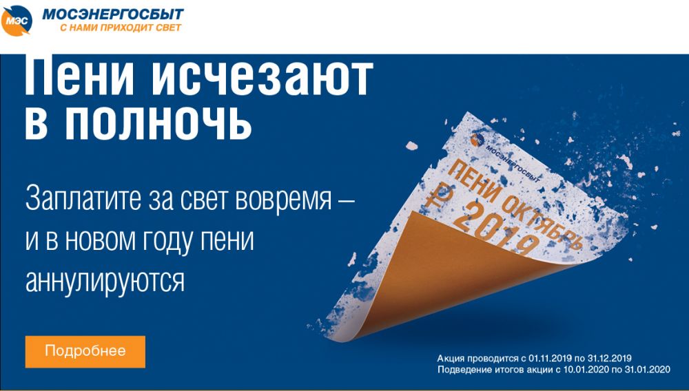 АО «Мосэнергосбыт» объявляет уникальную акцию «Пени исчезают в полночь», участникам которой при выполнении всех условий будут списаны пени, начисленные за несвоевременную оплату электроэнергии.