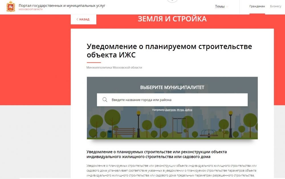 Собираетесь построить частный дом? Вам необходимо знать, что с августа 2018 года в Московской области действует уведомительный порядок. Для вашего удобства мы запустили электронный сервис, позволяющий подать уведомление не выходя из дома.