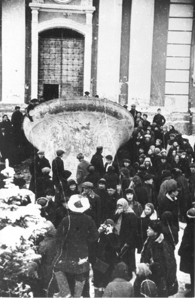 В январе 1930 года в ходе антирелигиозной кампании сброшенный с колокольни «Царь-колокол» рухнул перед её южным фасадом — там, куда за 180 лет до того его доставили жители Троицких слобод. В 1930 году потомки тех слободчан разбили поверженный колокол на куски и с удовольствием позировали на их фоне перед фотографами. Одним из них был писатель Михаил Пришвин — чьи снимки вы видите сейчас перед собой.