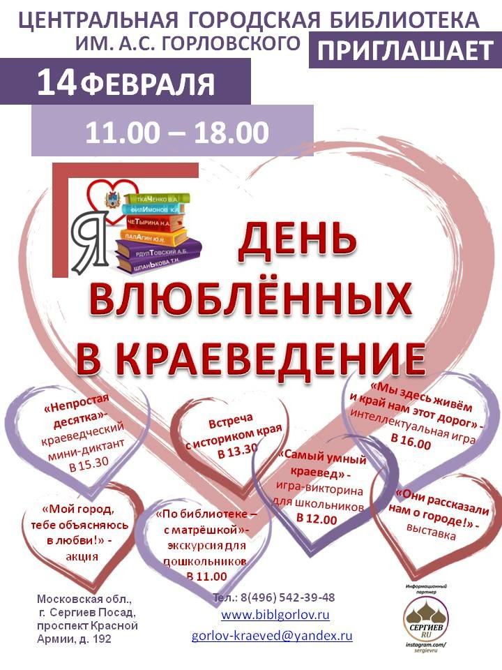 Представьте себе, в нашей библиотеке в этот день мы тоже ждём влюблённых, всех влюблённых в наш город, в краеведение! Приглашаем объединить наши усилия и ещё раз выразить симпатию к Сергиеву Посаду в стихах и прозе, проверить свои знания в краеведческом мини-диктанте «Непростая десятка» и, играючи, вспомнить историю Радонежья в интеллектуальной игре, познакомиться с материалами выставок и сфотографироваться в нашей фото-зоне.