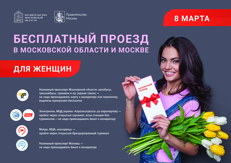 В Международный женский день женщины смогут ездить бесплатно на всех видах общественного транспорта Московской области и Москвы. Напомним, что соответствующее решение принято Губернатором Московской области Андреем Воробьёвым и Мэром Москвы Сергеем Собяниным.