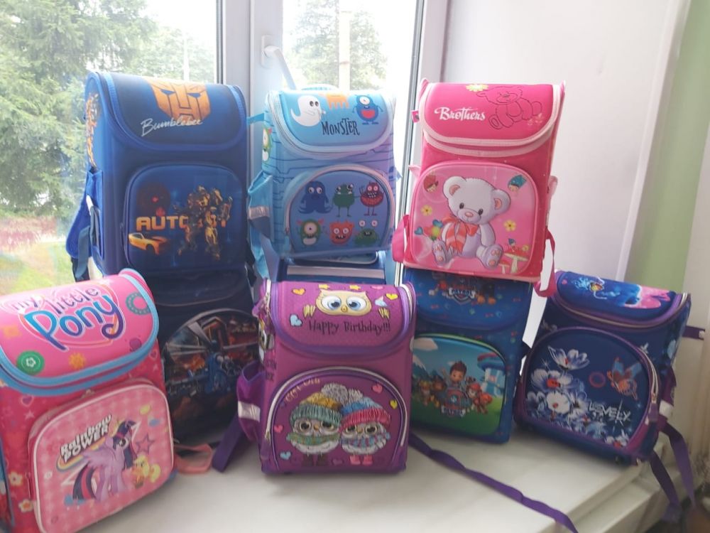 Рюкзак, пенал, тетради, подставка для книг, цветная бумага, альбом для рисования, акварельные краски и кисти, обложка для тетрадей и канцелярские принадлежности.