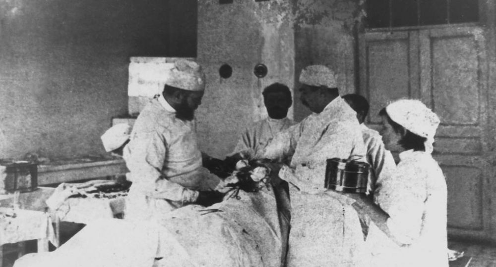 Хирург В. Ф. Войно–Ясенецкий (слева) проводит операцию в земской больнице