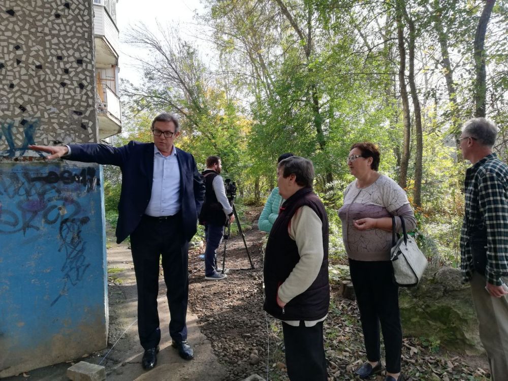 Зато в зелёной зоне за домом кипит работа: там готовят основание под асфальтовую дорожку, которая, по-видимому, будет вести к школе № 1. Жители, присутствовавщие на встрече, попросили депутата остановить работы. Мол, здесь и раньше была тропа, но если ее благоустроят, тихая зелёная зона превратится в проходной двор. Работы тут же свернули.