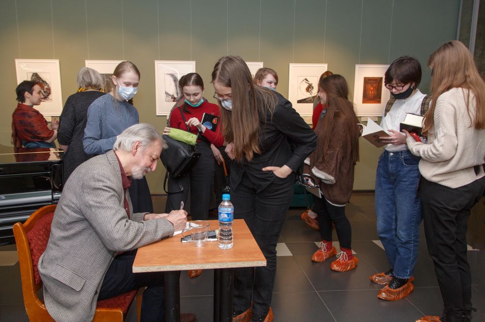 Его график как автора расписан более чем на год вперёд. Книжная отрасль сейчас переживает не лучшие времена и, предположил другой посетитель, повышение цен на офсетную бумагу, что в издательском цеху уже назвали беспрецедентным, скажется и на числе заказов. Художник ответил отрицательно, на себе он этого не почувствовал. И вообще дела печатные на самом деле не так плохи: «Иногда думаю, кто покупает бумажные книги, кто? Но приходишь в магазин «Москва», а он полон книг».
