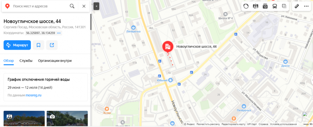 Уже в июле жители Сергиево-Посадского округа смогут увидеть график планового отключения горячей воды в своих домах на сервисах Яндекс.Карты, как в мобильной так и в обычной версиях.