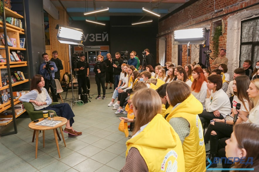 В зале творческого пространства «Трикотажка-плейс» на улице Карла Маркса собрались десятки заинтересованных слушателей. Обсудили, всё, что интересно современным 15-25-летним: как запустить свой проект, что интересного посмотреть по Пушкинской карте и какие качества нужны, чтобы стать министром культуры.