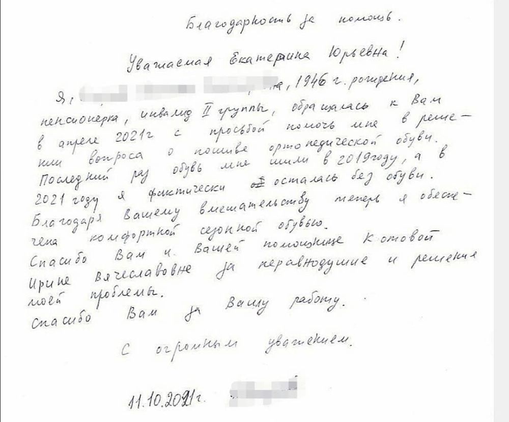 С просьбой о помощи инвалид второй группы из Серпухова обратилась к Уполномоченному по правам человека в Московской области Екатерине Семёновой. Суть письма состояла в том, что между профильным госорганом и производителем обуви был заключен контракт на оказание услуги по изготовлению ортопедической обуви, однако исполнитель не смог обеспечить достаточное качество обуви, в результате чего конечный пользователь – инвалид – был ущемлен в своих правах.