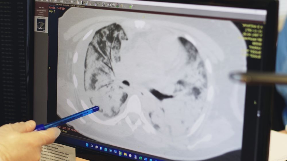 Так выглядит тотальное поражение легких на компьютерной томографии.