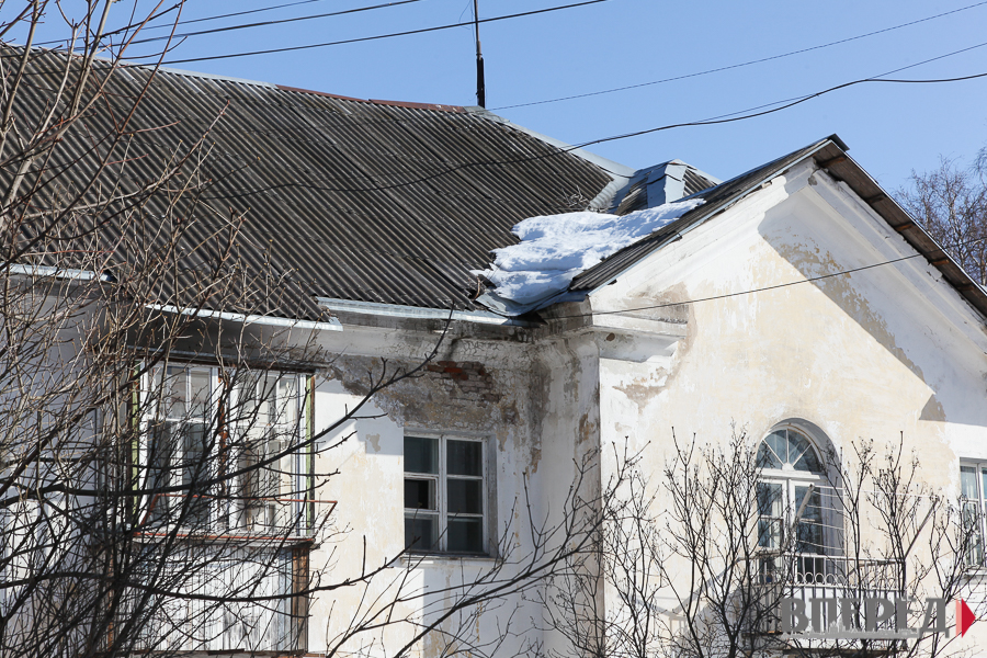 Не так давно сугроб, образовавшийся в месте стыковки двух скатов, утащил за собой железный лист, обнажив стропила. Эту кровлю отремонтируют одной из первых