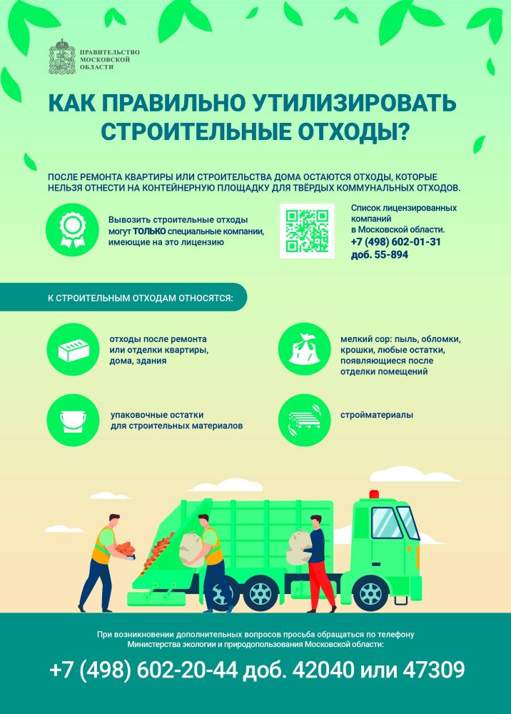 Утилизировать такие отходы вместе с обычными бытовыми отходами нельзя, поэтому складировать его нужно отдельно. Управляющая компания должна установить контейнер для сбора строительных отходов на специальных площадках для складирования крупногабаритных отходов. Вывозить строительные отходы могут только специальные компании, имеющие на это лицензии. Список лицензированных компаний в Московской области можно узнать по телефону +7 (498) 602-01-31 доб. 55-894.