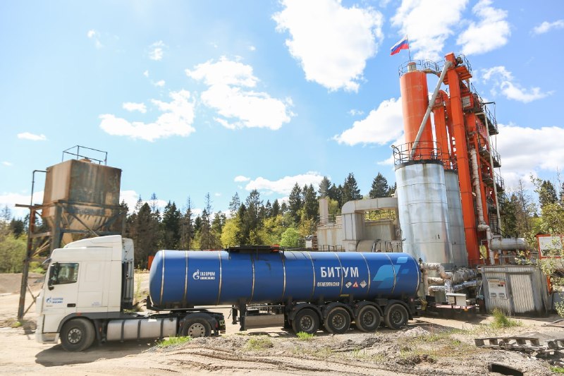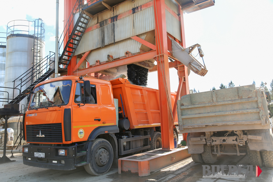 На территории завода — большие кучи песка и щебня разной толщины и объёма. Это составляющие для разного вида асфальта. У каждого свой технологический рецепт. Например, евроасфальт состоит из четырёх фракций щебня, минерального порошка и специального битума, обладающим хорошим сцеплением с основой. Песок и щебень по очереди засыпают на конвейер через электронное дозирующее устройство, которое управляется с компьютера. Затем каменные фракции отправляются в сушильный барабан, где они нагреваются до определённой температуры. Следующий этап — бункер-смеситель, расположенный в самой верхней части установки, где добавляется минеральный порошок и битум. После всех манипуляций горячий асфальт попадает в бункер-накопитель, а оттуда — непосредственно в кузов самосвала, который транспортирует готовую продукцию.