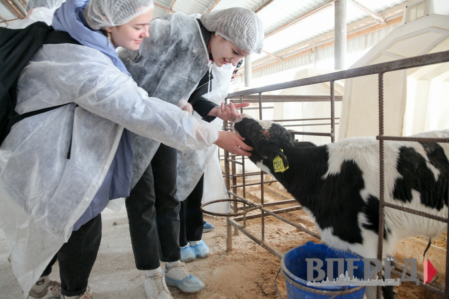 На экскурсии по ферме студентам показали места содержания коров и телят, а также современный доильный зал, рассчитанный на 32 коровы. Процесс доения проходит от трёх до четырёх минут, надои учитываются автоматически, у каждой коровы свои показатели. На дойку, кстати, коровы заходят самостоятельно. Всего же в хозяйстве около 1800 голов, из них дойных —726.
