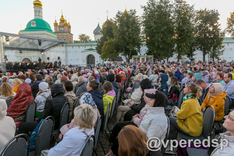Не помешала погода и в этот раз: несмотря на вечернюю прохладу, постановку зрители смотрели до конца. Как, в свою очередь, не помешал артистам и перезвон колоколов Троице-Сергиевой лавры, который вплетался в музыку оркестра, умело управляемого дирижёром Валерием КИРЬЯНОВЫМ.