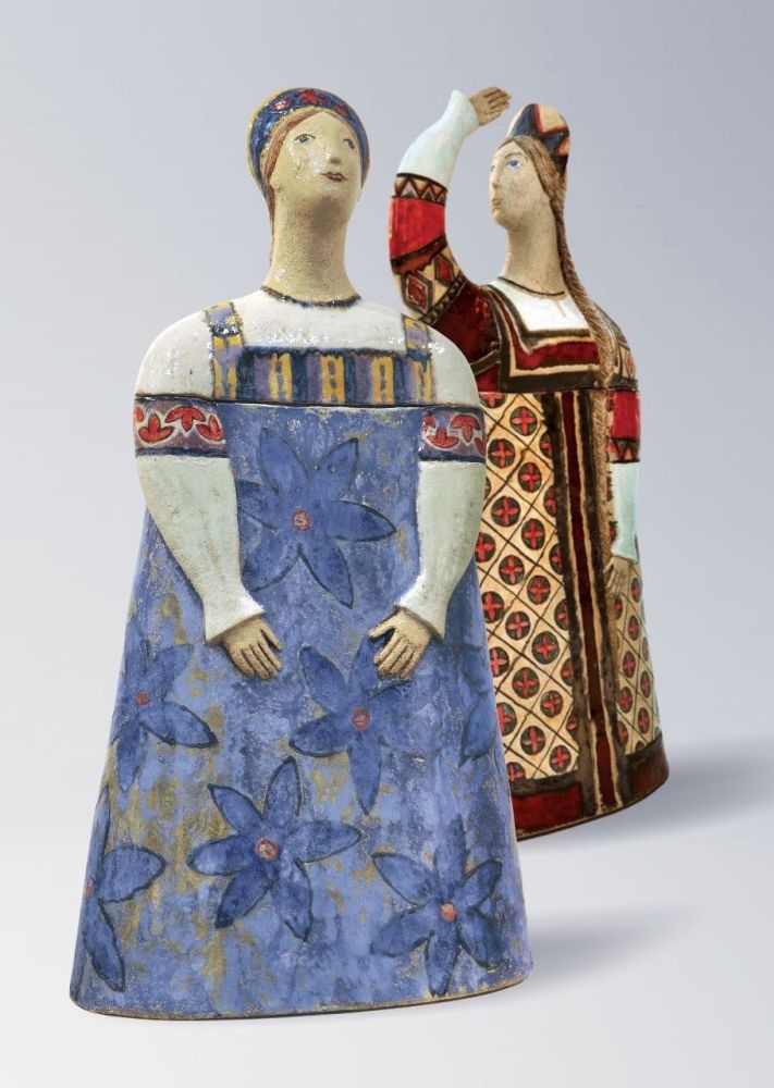Это настоящая керамика хорошего настроения: трогательные физкультурницы, сказочные коты и цветы, яркие блюда. В этих работах чувствуется подход автора, которому одинаково близки и форма, и цвет.