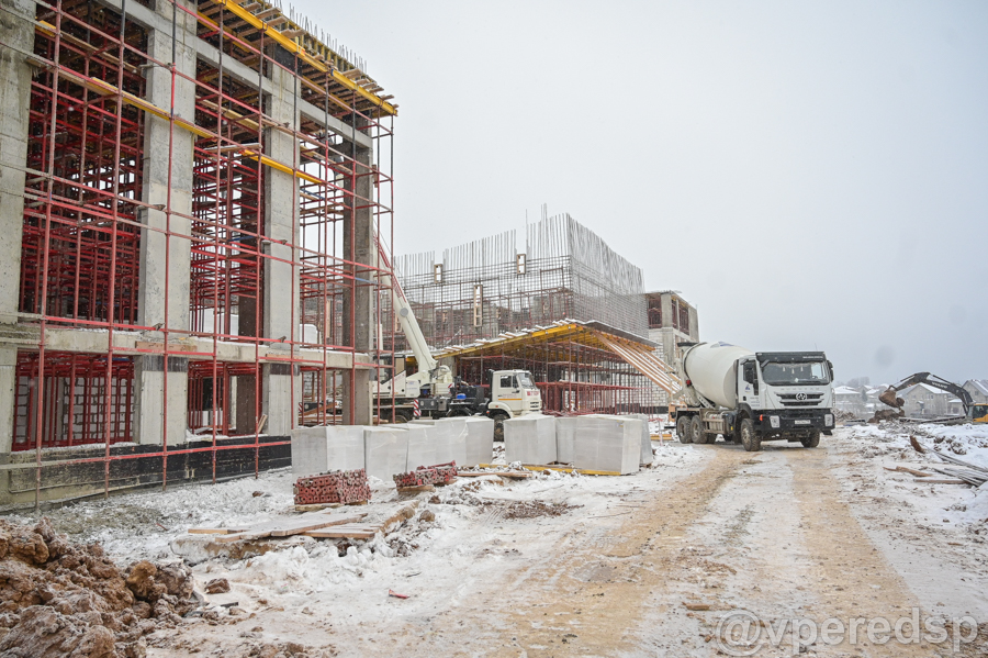 Сейчас параллельно ведутся и наружные, и внутренние работы, строятся внутриплощадочные инженерные сети, идёт прокладка силового электрокабеля. Монолитчики закончили спортзал и этажи, на очереди — центральная часть, где будет второй спортивный и актовый залы.