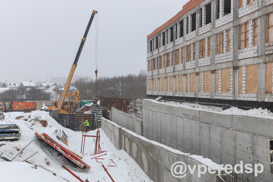 Возведение «коробки» здания завершено, и, по обещаниям подрядчика, в ближайшее время будет выполнено бетонирование входной группы, включая кессонное перекрытие — масштабный козырёк над входом, который является достаточно сложным инженерным решением.