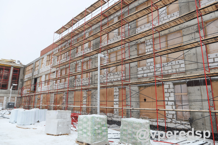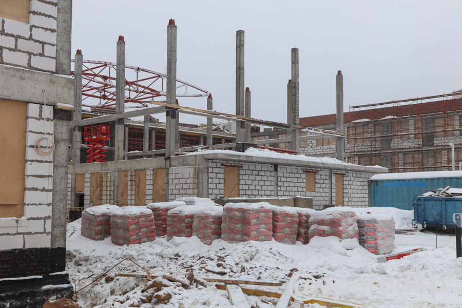 Между тем, стройка идёт практически в экстремальных условиях, учитывая недавние морозы. «Есть у нас с этим проблемы, даже скрывать не буду, по теплу, — сообщил представитель подрядчика, ведущего строительства объекта. — Но сейчас мы завезли модульную котельную. На солярке уже отапливаемся, сейчас запустим тепловой пункт: если всё пойдёт, по «времянке» будем запускать первую секцию и вести внутреннюю отделку».