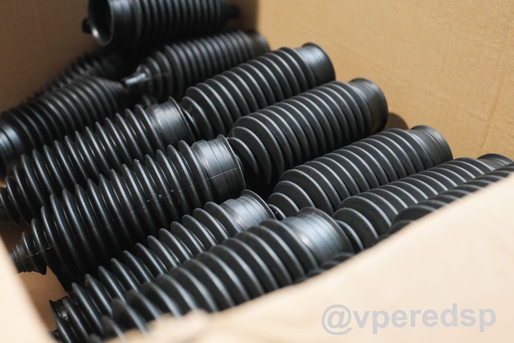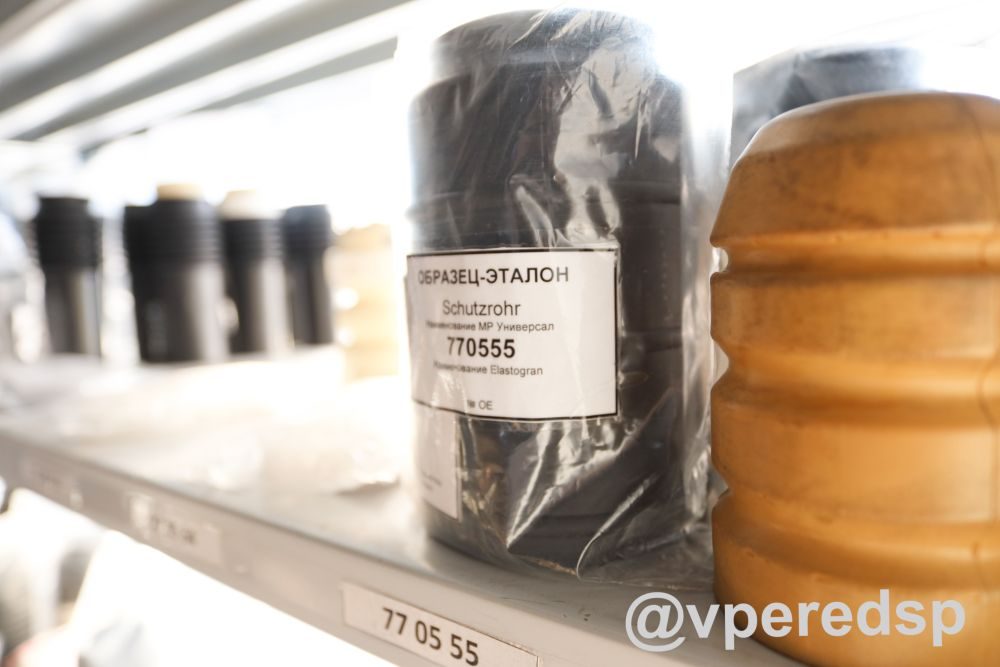 Механизм производства защитных комплектов и пыльников примерно одинаковый: сначала материал поступает в станок, где методом экструзии формируется заготовка, которая затем раздувается воздухом изнутри для создания полой детали. После чего готовая деталь попадает на ленту. Далее сотрудники вручную обрезают лишние части материала. Также на предприятии используют литьевые станки: форма смыкается, и материал в неё подаётся под давлением. Отметим, что все отходы производства направляются в дробилку и используются по новой. А сами запчасти проверяет служба качества: у каждого изделия имеются свои эталоны.