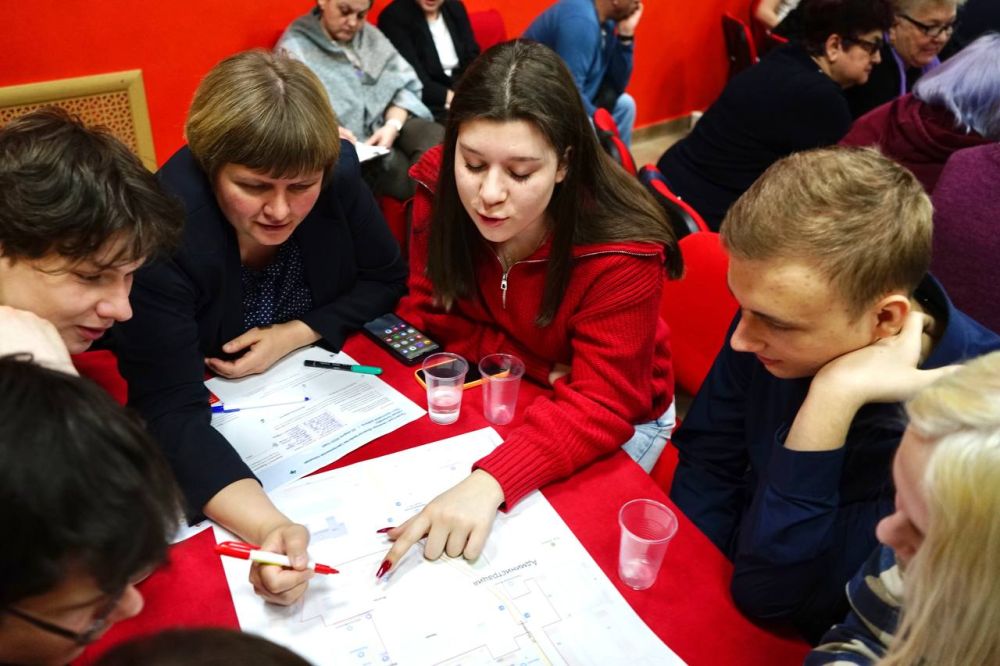 Обсуждения проходили довольно бурно: в зале собралось не меньше полусотни активистов разных возрастов. Среди интересных предложений, которые они озвучили — установить на площади электросамокаты и убрать лавочки.