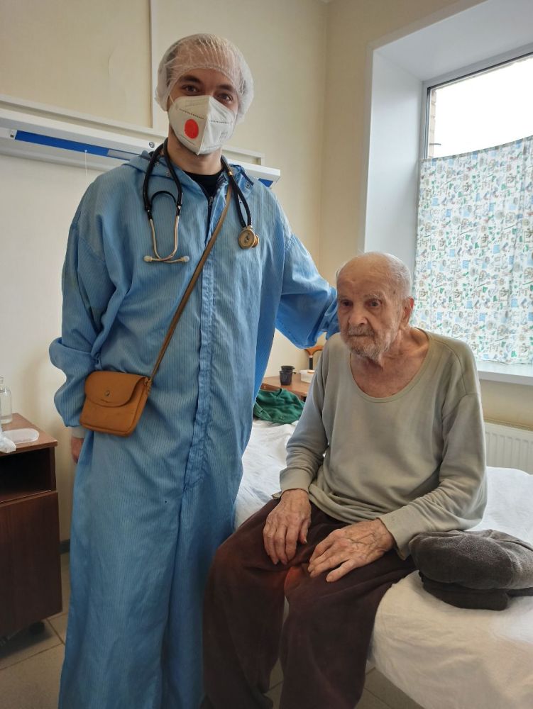 «Болел сильно, слабость была. Медик со «скорой» обследовал меня и поставил двухстороннюю пневмонию. Дома, говорит, не вылечили бы меня родные. Я спрашиваю: куда везёте-то? Мне отвечают: в Загорск! Погрузили, и вот, я здесь. Скажу так: очень доволен отношением к себе. И врачи, и медсёстры — отличные!», — говорит дедушка.