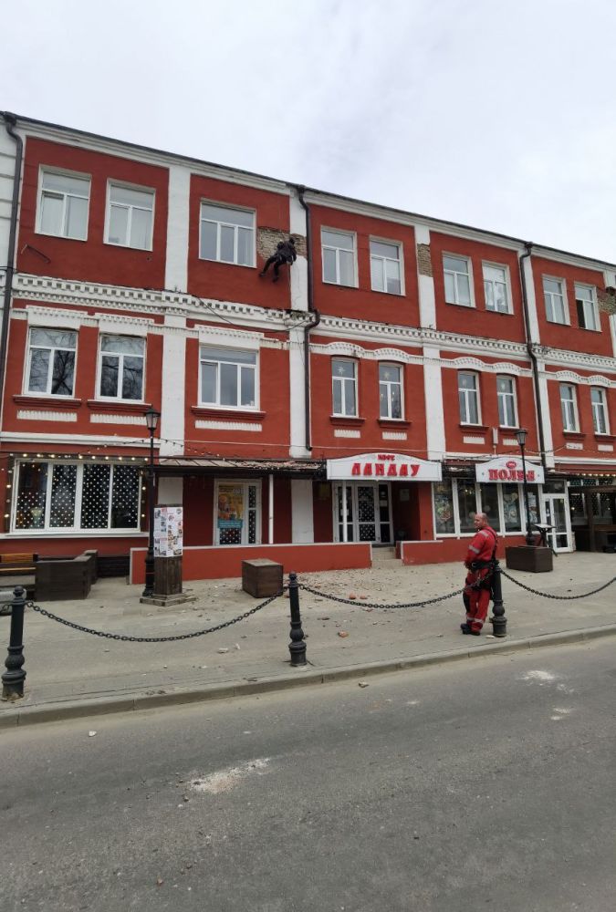 Как удалось выяснить, это всего лишь ремонтные работы фасада. По нему пошли небольшие трещины, в которые заливается вода и в морозы получившийся лёд просто выдавливает штукатурку. Уже был случай падения небольшого фрагмента отделки, к счастью, обошлось без пострадавших.