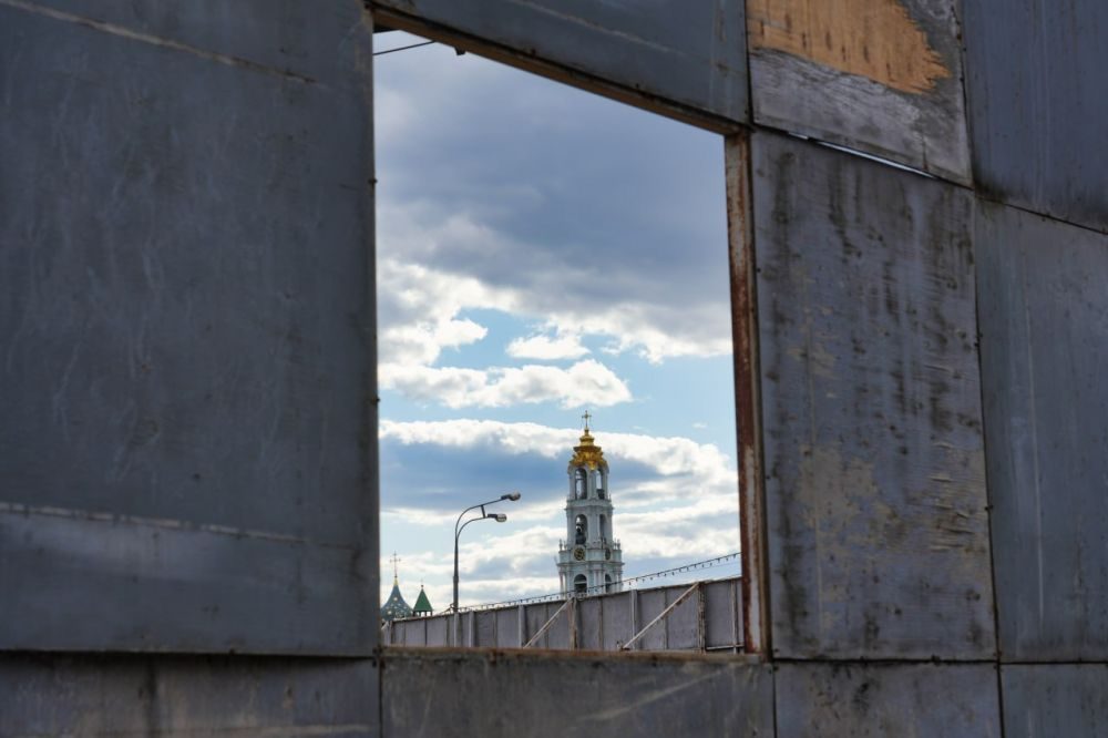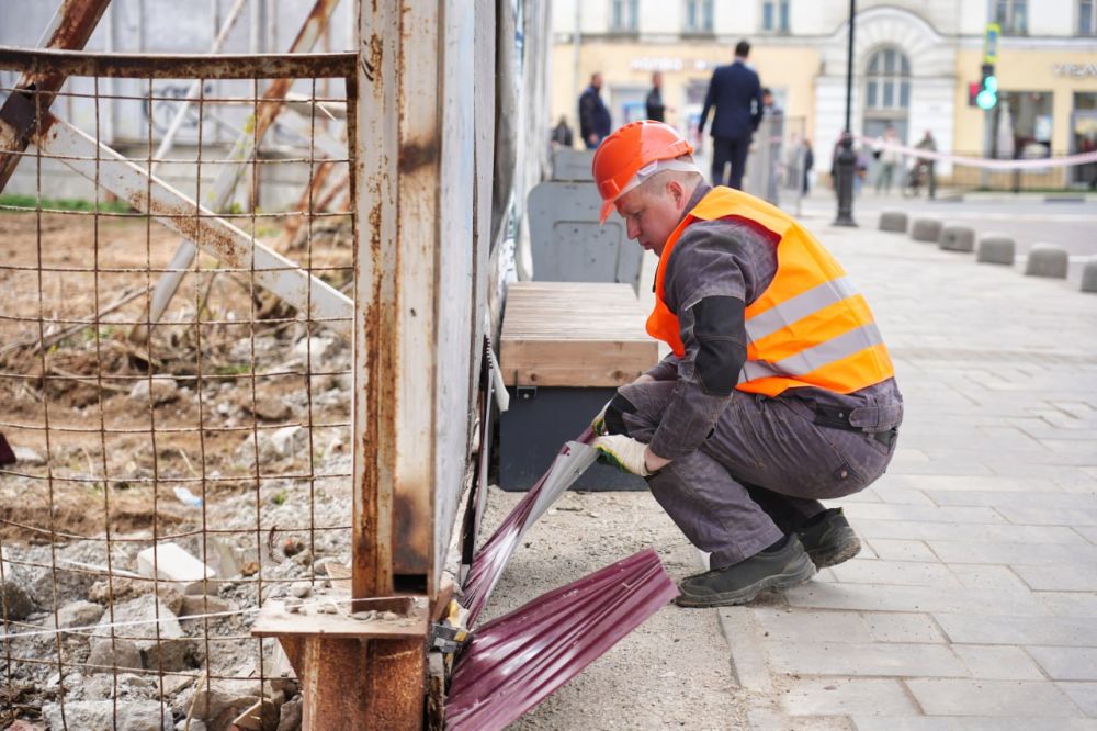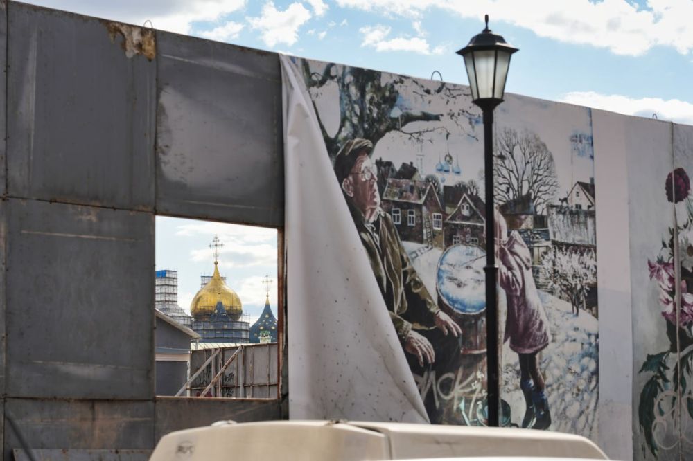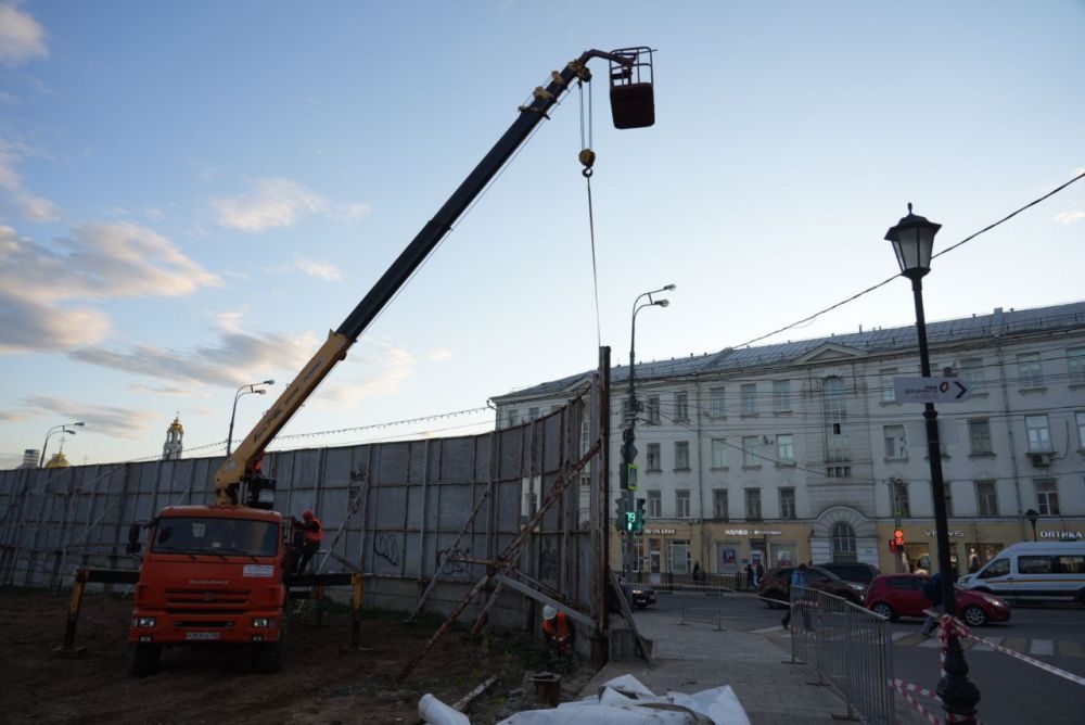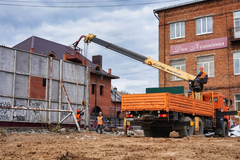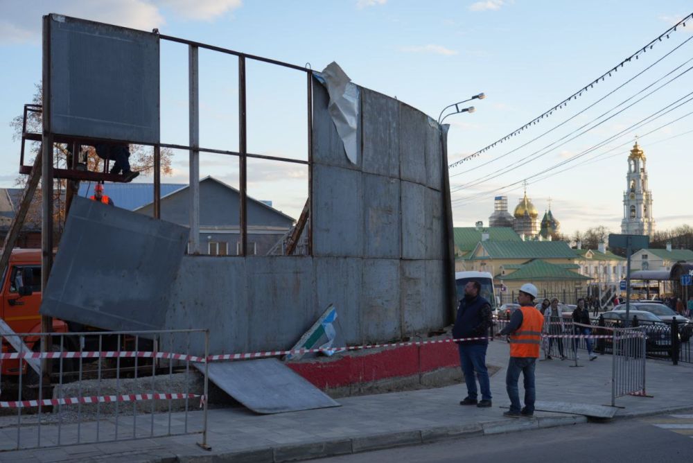 Рабочие открывают взору территорию между Домом художника и зданием Сергиево-Посадского историко-художественного музея в центре города напротив Белого пруда.