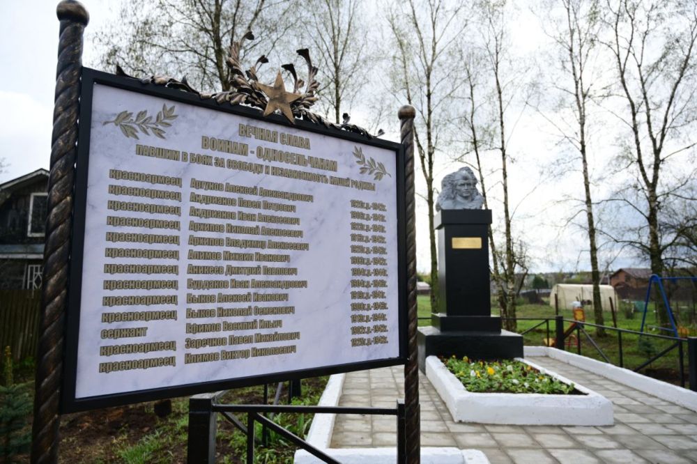 У памятника погибшим землякам, установленного больше полувека назад, появились антивандальные скамейки из переработанного пластика, мемориальные стенды с уточнённой информацией о местных жителях, ушедших на фронт.