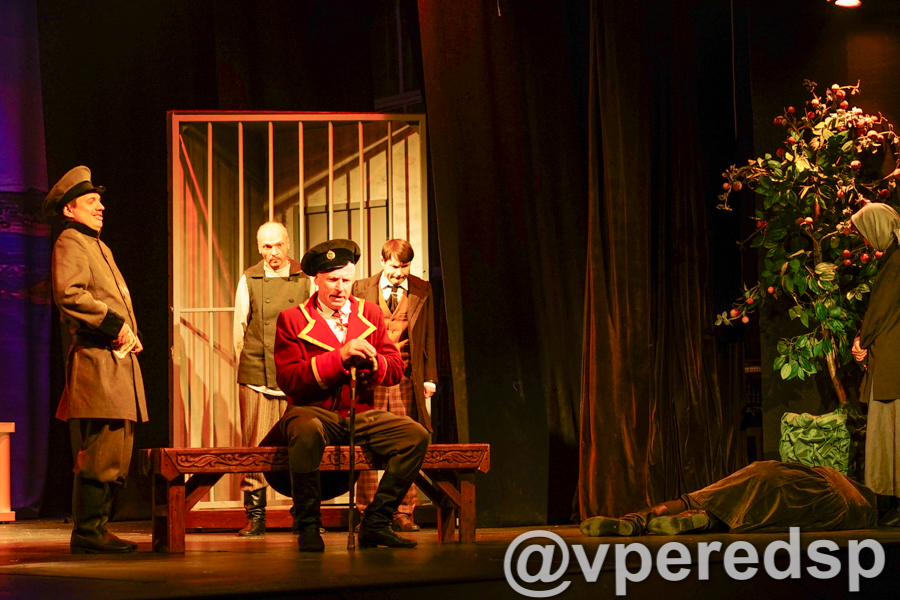 Персонажи пьесы ювелирно раскрывают перед зрителями разные человеческие пороки. Вечно пьяный купец Павлин Павлиныч Курослепов (Игорь Сидоркин), потерявший связь с реальностью от водки, взяточник городничий Градобоев (Владимир Шелехин), живущий по принципу – не подмажут, не поеду, разорившийся купец, мот и кутила Василий Шустрый (Александр Кравченко), который, чтобы не идти на службу, готов продаться в шуты помещику Тарасу Тарасовичу Хлынову (Павел Зверев). Последний самый гротескный персонаж, он очень богат и поэтому уверен, что имеет власть над всеми людьми.