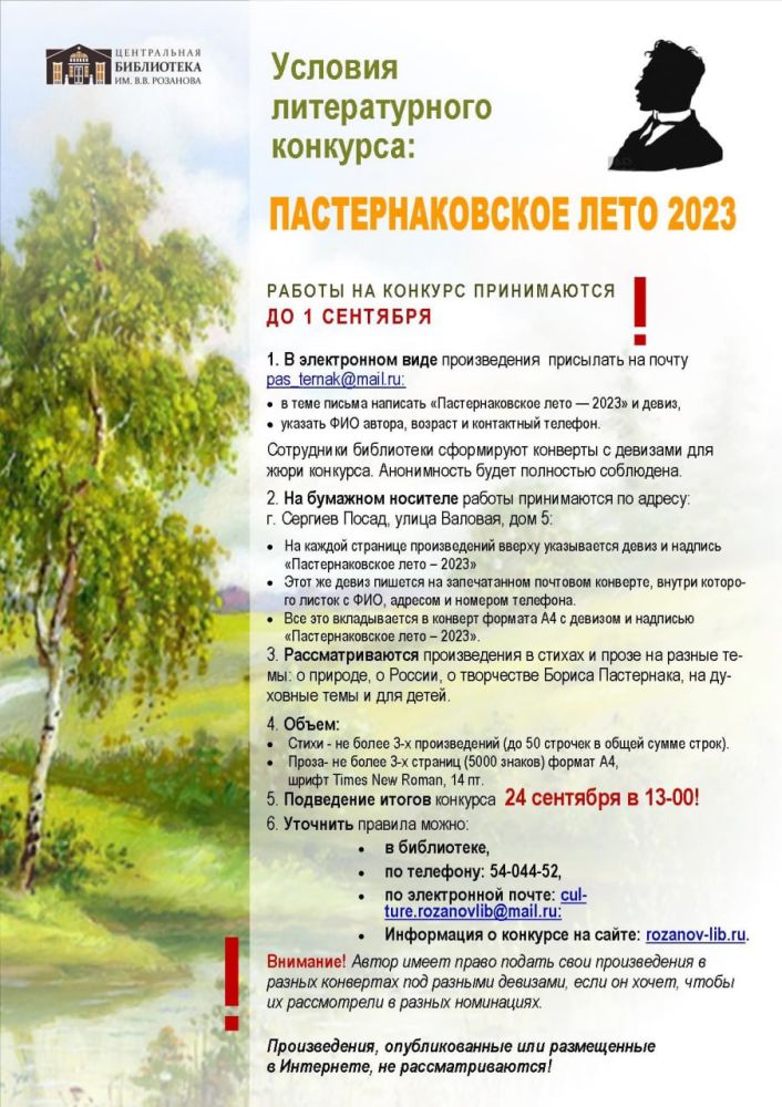— В теме письма написать «Пастернаковское лето — 2023» и девиз, указать ФИО автора, возраст и контактный телефон;