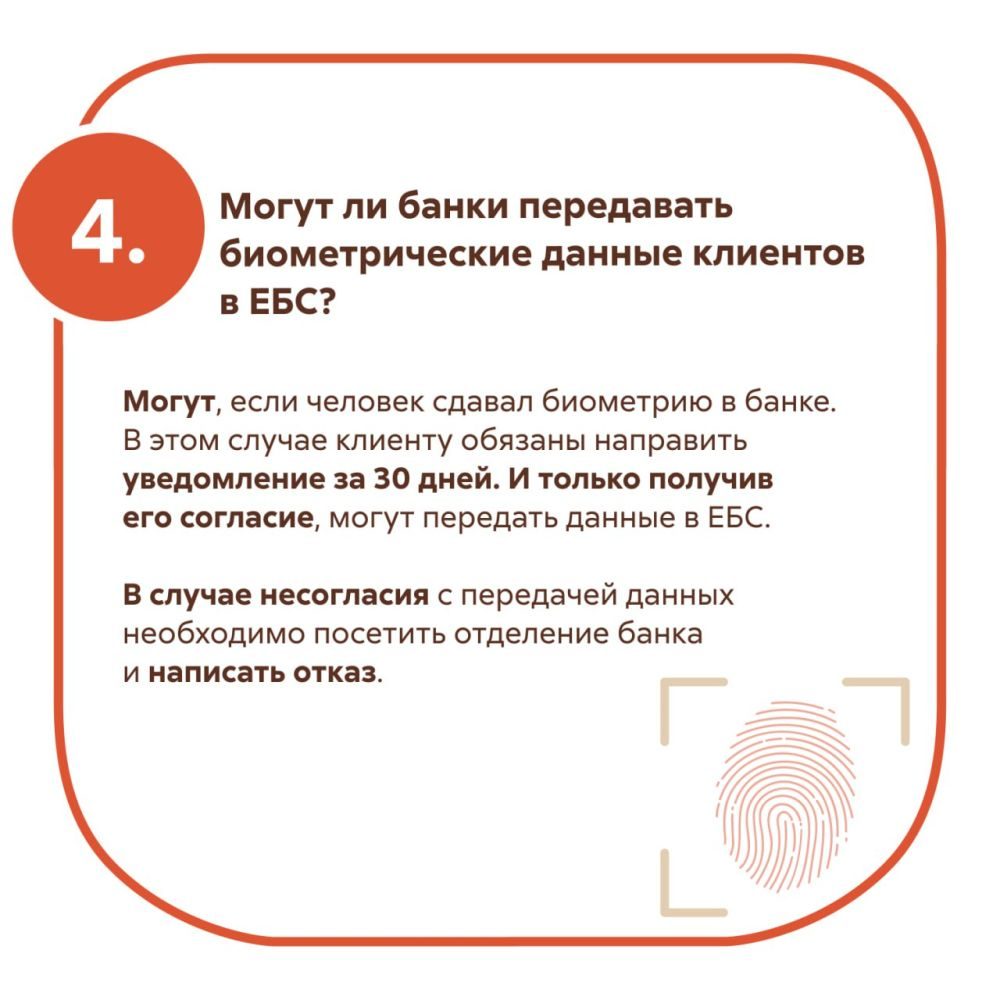 Мои биометрические данные у банка уже есть, в базу они пока не попали, но, как мне объяснили, это лишь дело времени. По Закону (от 27.07.2006 № 152-ФЗ), с 1 июня по 30 сентября организации, ранее собиравшие биометрические данные, должны передать их в систему ЕБС. То есть имеются в виду только те данные, которые раньше добровольно уже были сданы. И о том, что банк передаёт эти данные в ЕБС, меня обязаны уведомить за 30 дней, скорее всего, через тот же мобильный банк. Без моего согласия банк ничего никому не отправит. Только вот моё молчание — это уже знак согласия, тогда как отказ должен быть зафиксирован письменно, приходите в банк и пишете заявление.