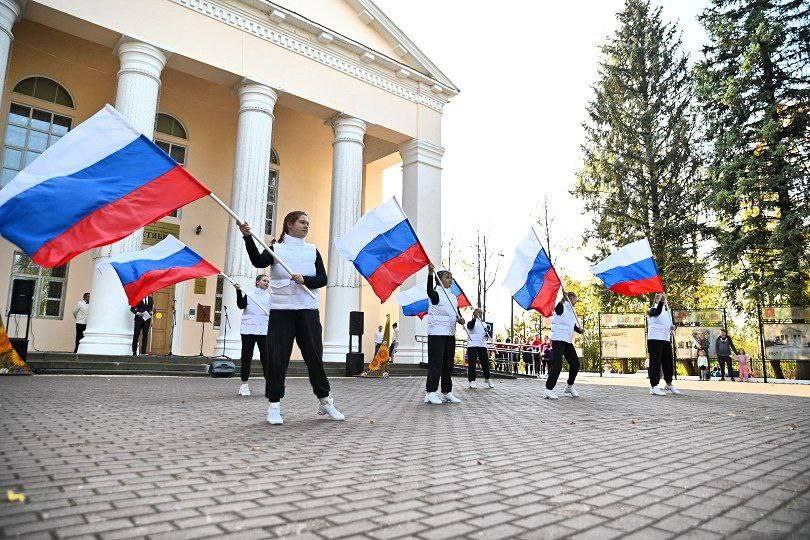 Сегодня по случаю праздника у фасада ОДЦ «Октябрь» прошёл торжественный флешмоб и концерт творческих коллективов.