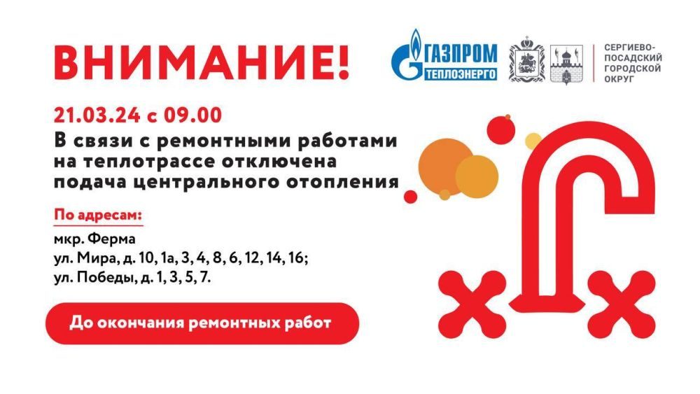 «Газпром Теплоэнерго МО» сообщает об отключении отопления
