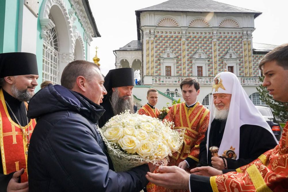 Предстоятеля Русской православной церкви вместе с наместником Лавры, епископом Сергиево-Посадским и Дмитровским Кириллом у южных врат Троицкого собора встретил глава округа Дмитрий Акулов.
