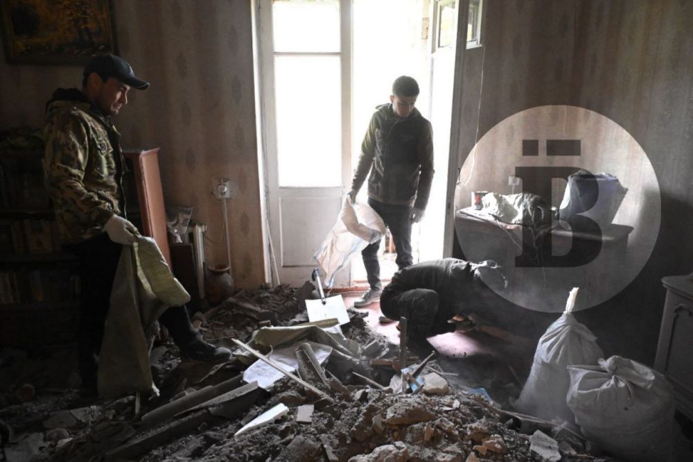 Рабочие управляющей компании убирают мусор в комнате, где провалившаяся крыша вызвала обрушение потолка. Жителям предложено переехать в маневренный фонд.