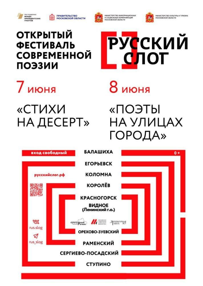 7 и 8 июня в десяти подмосковных городах, среди которых есть и Сергиев Посад, состоится открытый фестиваль современной поэзии «Русский слог». Его участниками станут авторы от 18 до 45 лет, получившие приглашения по результатам рассмотрения заявок на отборочном этапе.