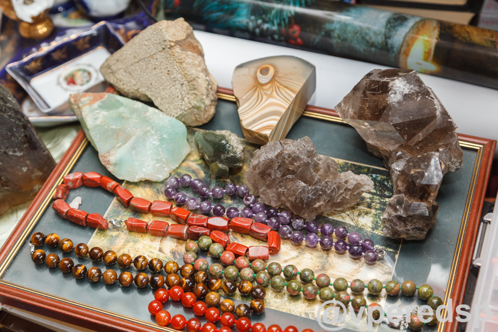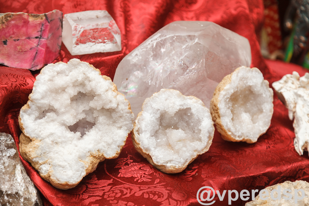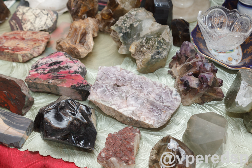 «Вот ещё интересный образец, «волосатик». Это кварц, проросший нитями рутила… вот там, видите, ниточки такие, это как раз минерал титана. «Волосатики», кстати, очень ценят и коллекционеры, и женщины. А вот празем — зелёный кварц, найден в Нижнем Тагиле, он с вкраплениями эпидота и пластинчатого плагиоклаза», — оперирует он различными фактами и малопонятными для многих названиями. Памяти, эрудиции и знаниям этого человека можно только позавидовать!