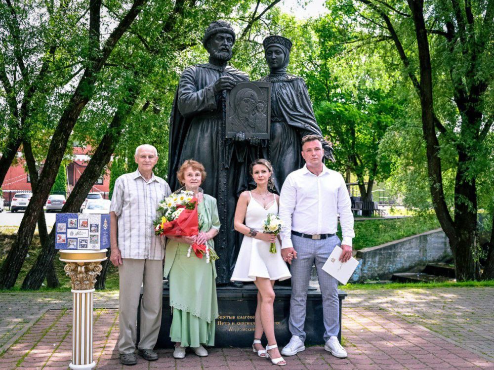 В преддверии Дня семьи, любви и верности, который отмечается 8 июля, у памятника Петру и Февронии Муромским в Сергиевом Посаде прошло сразу две регистрации брака