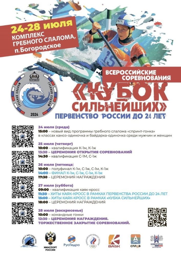 В среду, 24 июля, в Комплексе гребного слалома в п. Богородское стартуют Всероссийские соревнования «Кубок сильнейших» по гребному слалому среди мужчин и женщин, в рамках которых пройдёт и первенство России среди спортсменов до 24 лет.