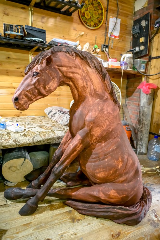 Переступив порог его «волшебного гаража», мы сразу же увидели сидящего на полу коня. Скульптура вырезана из двух массивных кусков сосны и очень реалистично проработана. Просто раскрасить — это не про Михаила. Плавные переходы от светло-коричневого к тёмно-коричневому мастер реализовал сочетанием сразу нескольких приёмов: обжига, пропитки маслом и нанесения масляного покрытия.