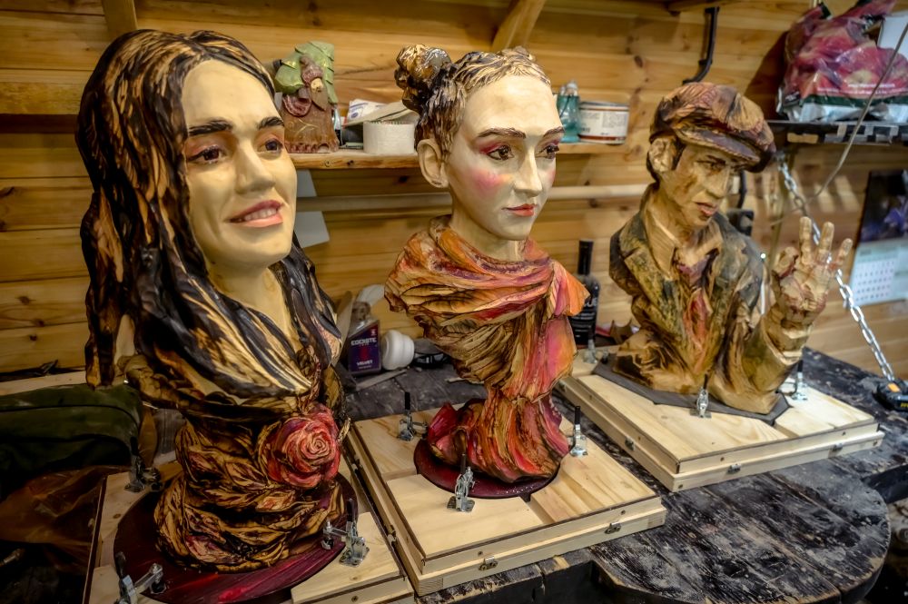 Другие впечатляющие работы Михаила Дудина — это бюсты. В день нашей «экскурсии» в мастерской было три готовых образа: два женских и один мужской. В них ещё ярче проявляется виртуозное умение импровизировать с фактурой дерева. Очень эффектно смотрится обжиг на длинных волосах девушки и на кепке-восьмиклинке Андриано Челентано.